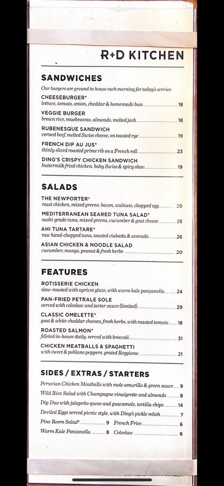 R+D Kitchen at Fashion Island in Newport Beach offers a trendy and classy dining experience specializing in burgers, bars, and sandwiches. With a focus on consistency in service and food quality, customers rave about favorites like the Ding's Crispy Chicken Sandwich and the French Dip Sandwich. The menu offers a range of options, including vegan and limited vegetarian choices. The restaurant provides a comfortable atmosphere with top-notch service, making it a regular spot for many patrons. Standout dishes like the crispy chicken sandwich and tuna tartare receive high praise for their flavorful profiles. Overall, R+D Kitchen is a must-visit for those seeking a delicious meal in a cozy and casual setting.